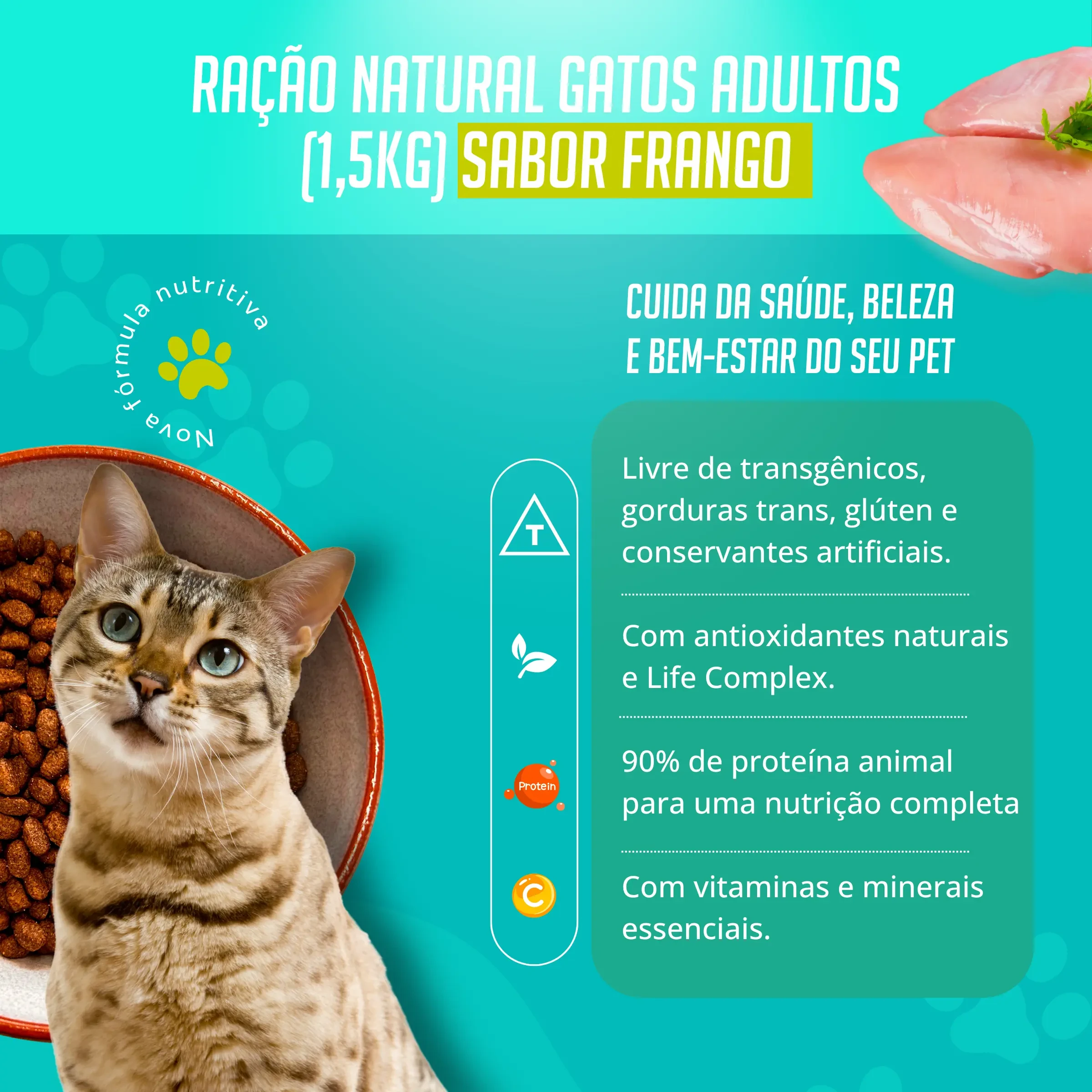 HLIFE NATURAL FRESH GATOS ADULTOS 1,5 KG PRODUTO Farinha de peixes (Atum e salmão), Farinha de vísceras de aves low ash, Farinha de vísceras de aves, Ovo em pó, Grão de arroz, Grão de sorgo, Trigo integral, Abóbora desidratada, Grão de aveia, Grão de linhaça (1%), Grão de quinoa, Lignocelulose, Polpa de beterraba, Fibra de ervilha, Semente de psylium, Levedura de cerveja inativada desidratada, Gordura de frango, Óleo de salmão, Palatabilizante (Hidrolisado de fígado de aves e suínos), Extrato de mirtilo (Blueberry), Cloreto de sódio, Cloreto de potássio, Fosfato bicálcio, Prebióticos (Mos, Fos e β-Glucanas), L-Carnitina, Dl-Metionina, L-Lisina, Taurina, Vitaminas A, C, D, E, K3, B1, B2, B6, B12, Ácido fólico, Biotina, Cloreto de colina, Niacina, Pantotenato de cálcio, Minerais: Iodato de cálcio, Selenito de sódio, Sulfato de cobre, Sulfato de ferro, Sulfato de manganês, Sulfato de zinco, Selênio quelatado, Zinco quelatado, Aditivo regulador de acidez, Antioxidante natural (Concentrado de tocoferóis e Extrato de alecrim), Extrato de yucca, Ácido propiônico, Zeólita. Sem adição de ingredientes transgênicos.